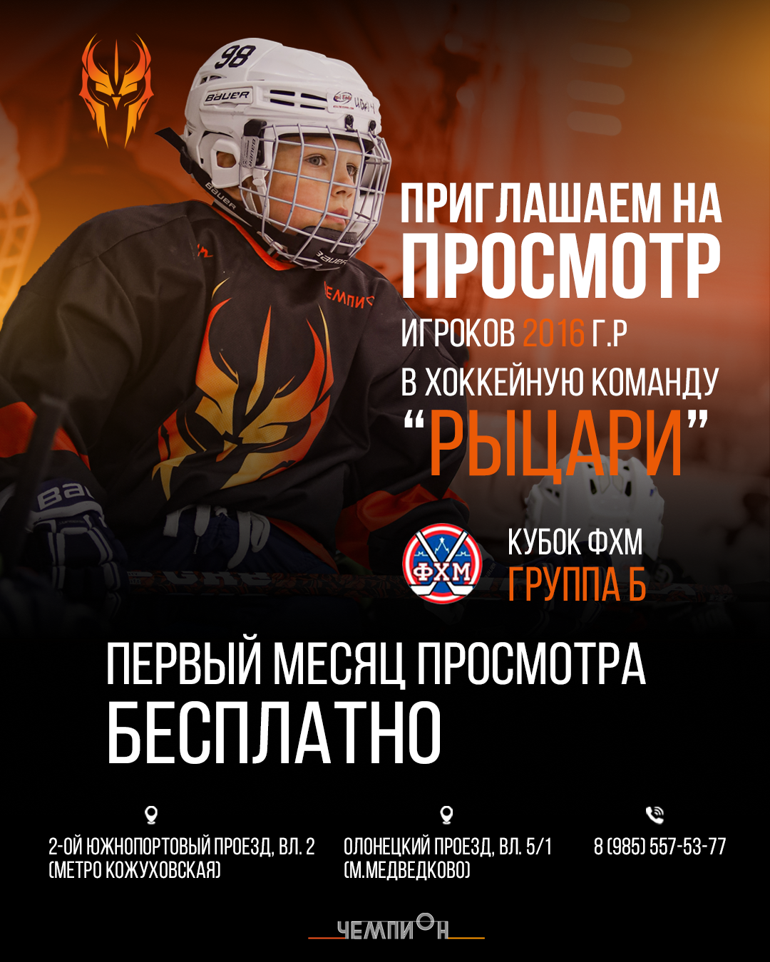 Ваш ребёнок мечтает собрать все хоккейные трофеи в мире? Побить рекорд Александра Овечкина? Тогда приглашаем на просмотр игроков 2016 г.р., ведь хоккейная школа «Рыцари» - лучшее место, где начинается путь к успеху 🔝🔝🔝
